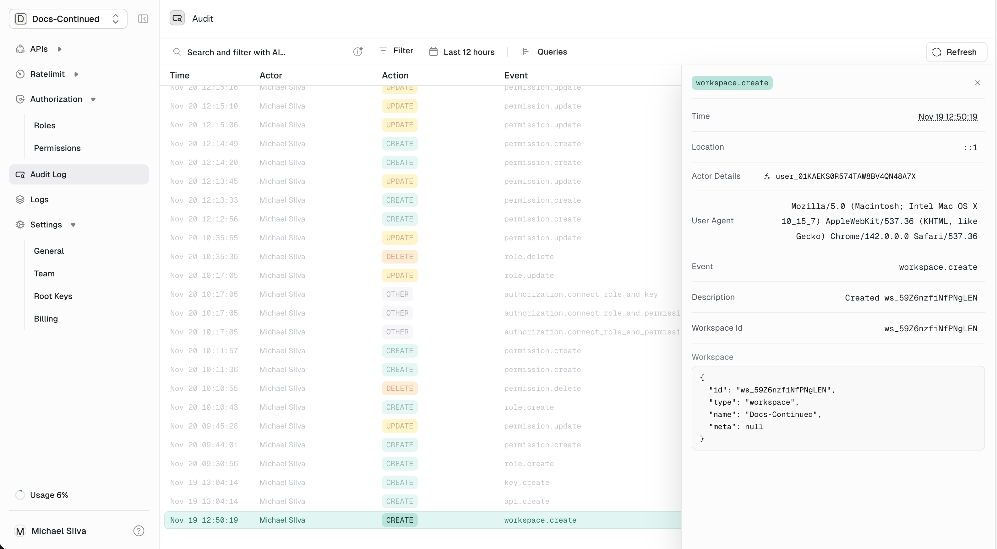 | Actor | Who made the change — a user (dashboard) or root key (API) |